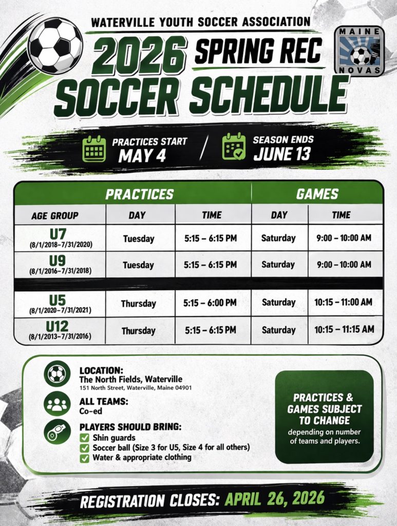 *ALL GAMES &PRACTICES ARE AT THE NORTH ST FIELDS @ 151 NORTH ST, WATERVILLE, ME